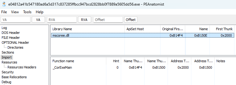 In PEAnatomist, we can see that the only function imported from the mscoree.dll library is _CorExeMain.