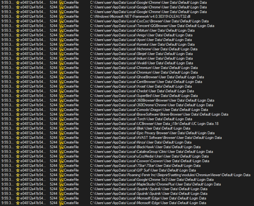 Among all observations in Process Monitor, the most interesting are the CreateFile() calls to a wide range of browser profiles attempting to access the Login Data files. This is a clear indication that the malware is designed to collect and decrypt sensitive information, such as saved passwords, from browsers.
