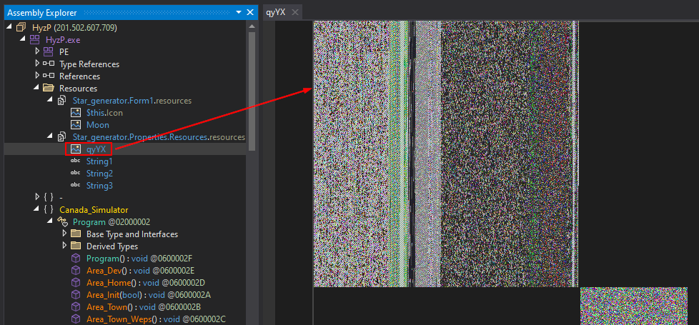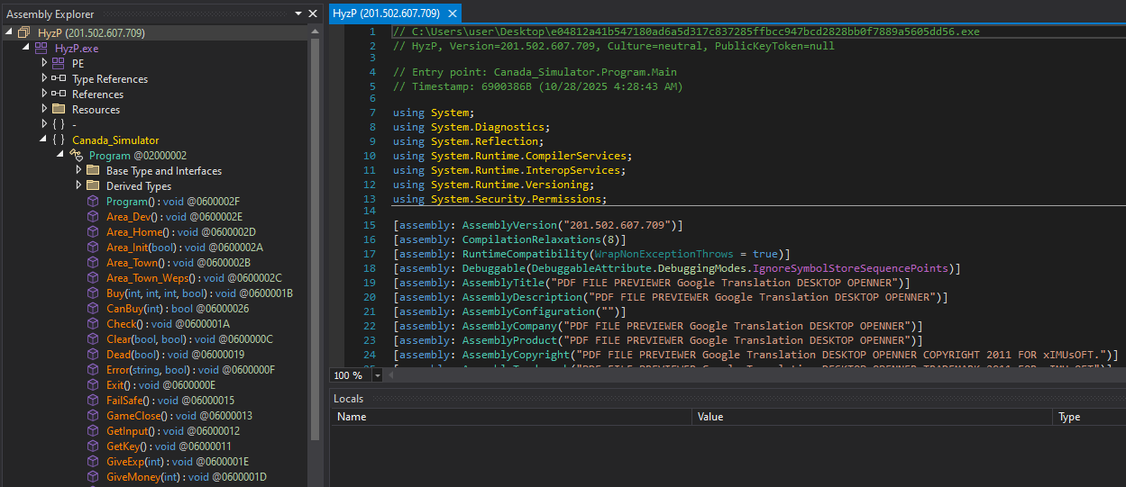 Since the malware is written in .NET, we can use dnSpyEx to reverse engineer the sample. After loading the binary, we can see that the first namespace is named Canada_Simulator, and the functions within this namespace appear to use naming conventions consistent with game-related codeD