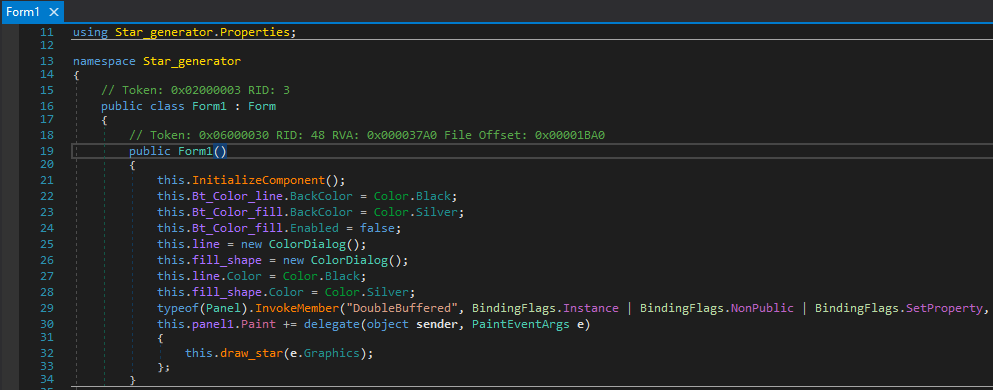 The entry point (Main()) calls Form1() from the Star_generator namespace, where the first function invoked is InitializeComponent().