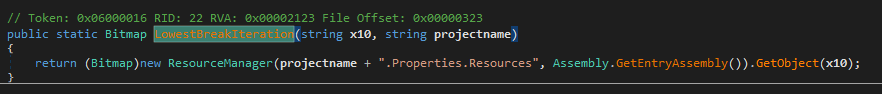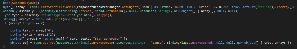 Inside InitializeComponent(), the malware loads a bitmap resource named Moon and then proceeds to call EmitStarfieldSample(), which contains the decryption logic.