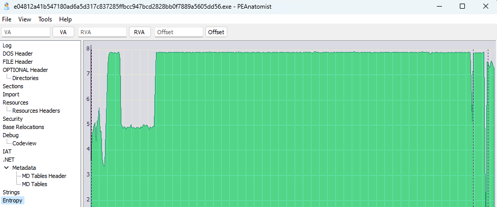 Additionally, the sample exhibits very high entropy, which strongly suggests that the malware is packed.