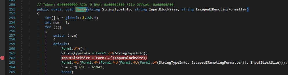 Before deobfuscating this stage, we can pause execution in the debugger just before the code is invoked to observe exactly what will be called. At this point, we can see that Form1 is being invoked inside the second stage from the initial stage with the following arguments: