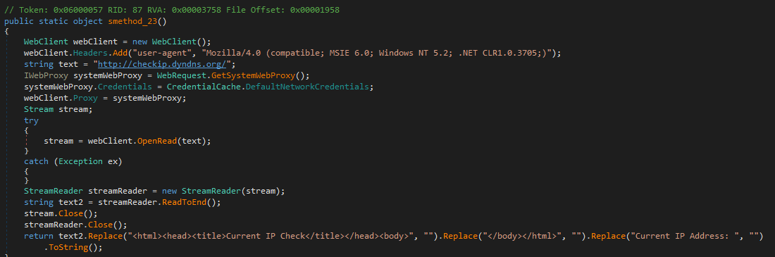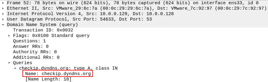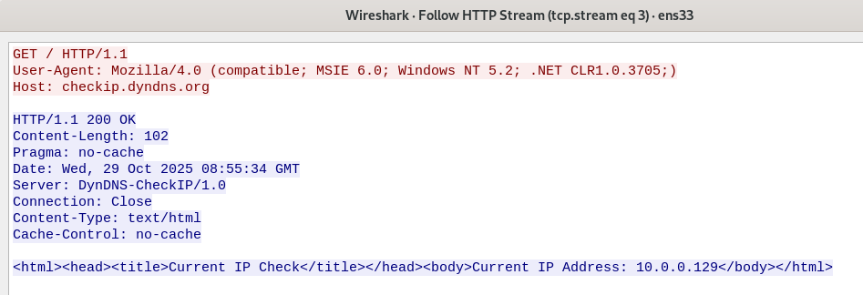 Running the sample and analyzing its network traffic in Wireshark shows that the malware queries the checkip[.]dyndns[.]org domain, which is used to determine the system’s public IP address.