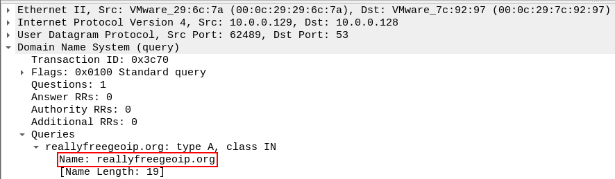 In addition to the IP address check, the malware also performs a DNS query to the reallyfreegeoip[.]org domain.