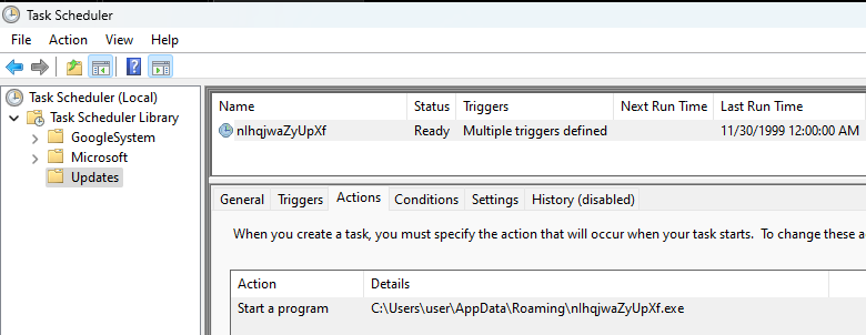 From the Task Scheduler, we can see that under the Updates section, the malware creates a task to execute its copied file.