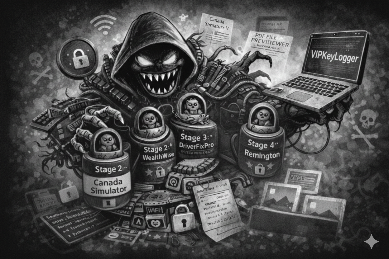 Canda_Simulator WealthWise: Heavily obfuscated .NET layer hidden in a bitmapDriverFix Pro: Stage requiring multiple deobfuscation toolsRemington: the final gatekeeper and core of VIPKeyLogger